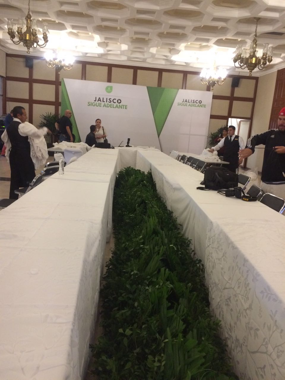 Terminado la rueda de prensa en un salón contiguo, el servicio de meseros de Casa Jalisco retiraba manteles para lavarlos y plantas ornamentales que solo sirven de eso, de adorno y que han de generar ciertos costos.