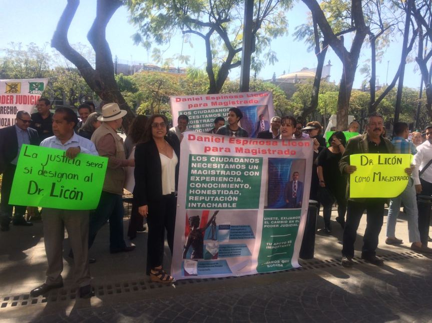 por Mario Díaz.- Un grupo de cuarenta personas la mayoría de ellos abogados penalistas, se manifestaron a las afueras del Congreso del Estado para impulsar la propuesta de Daniel Espinosa Licon como magistrado del Supremo Tribunal de Justicia del Estado de Jalisco.