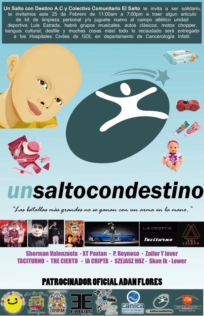 Las asociaciones Un Salto con Destino y Comunitario El Salto hacen una invitación a la población del Área Metropolitana de Guadalajara y de todos los rincones de Jalisco para que se unan este sábado 25 de febrero al evento que tiene como objetivo ayudar a niños con cáncer.