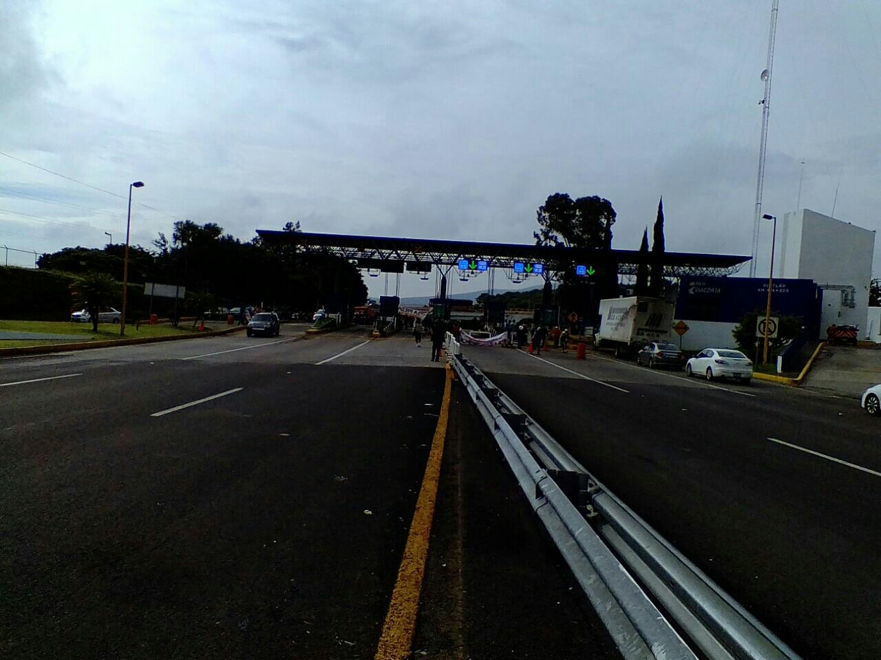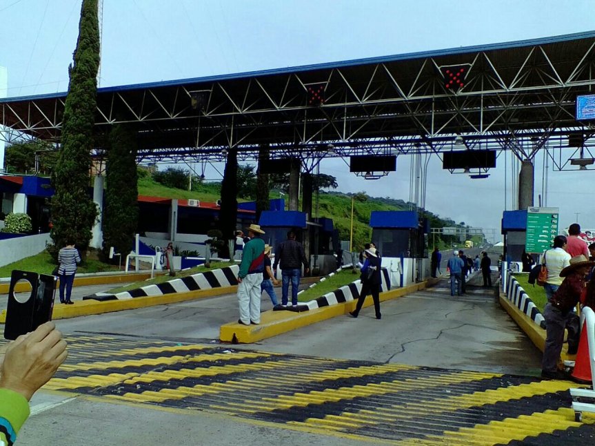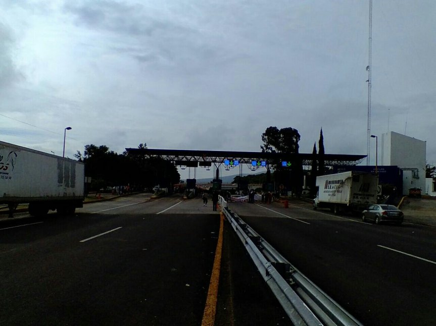 Toma de caseta de Ocotlan de la autopista Guadalajara-Morelia por docentes del SUACOBAEJ, profesores de la seccion XVIII del CNTE Michoacan y Asamblea Magisterial Democratica de Jalisco como parte de las acciones acordadas por la CNTE bloqueo carretero a nivel nacional.