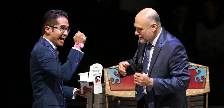 Con la conducción del actor Marco Antonio Treviño y la actriz Karina Gidi, se llevó a cabo la premiación en un escenario con elementos de utilería que remitieron al espacio escénico.