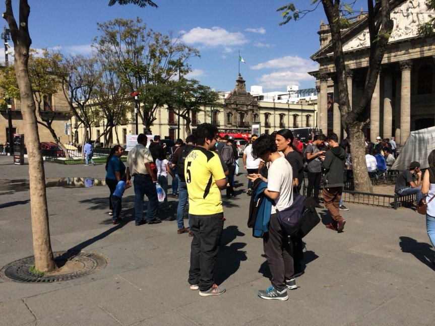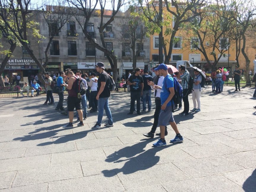 La tarde de este sábado al centro de Guadalajara acudieron decenas de jóvenes quienes con celular en mano (nada raro ni extraño) se congregaban en ciertos puntos de la plaza de La Liberación, como es común poco hablaban entre ellos por estar más al pendiente de sus pantallas de telefonía móvil.