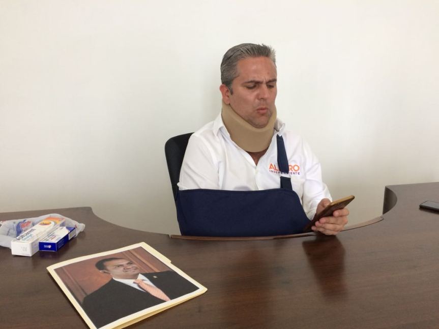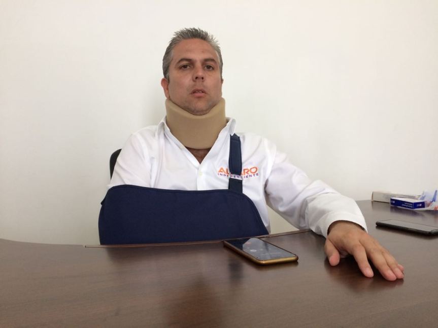 Sentado en su oficina de campaña perdiendo un día de actividad proselitista debido a los daños recibidos, Alberto Alfaro con collarín y una protección en su brazo derecho platica su versión.