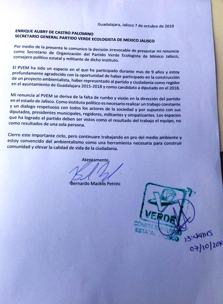 Sin embargo, pocos quieren quedarse a averiguar si esto va en serio o solo se trata de una medida mediática para evitar el éxodo de más militantes verdes, tan es así que el pasado lunes 7 de octubre Bernardo Macklis Petrini, presentó su renuncia tras nueve años de militancia, agradeciendo la oportunidad de haber participado en la construcción de un proyecto ambientalista y haber representado a su partido como regidos en el ayuntamiento de Guadalajara 2015-2018 y como candidato a diputado en el 2018.