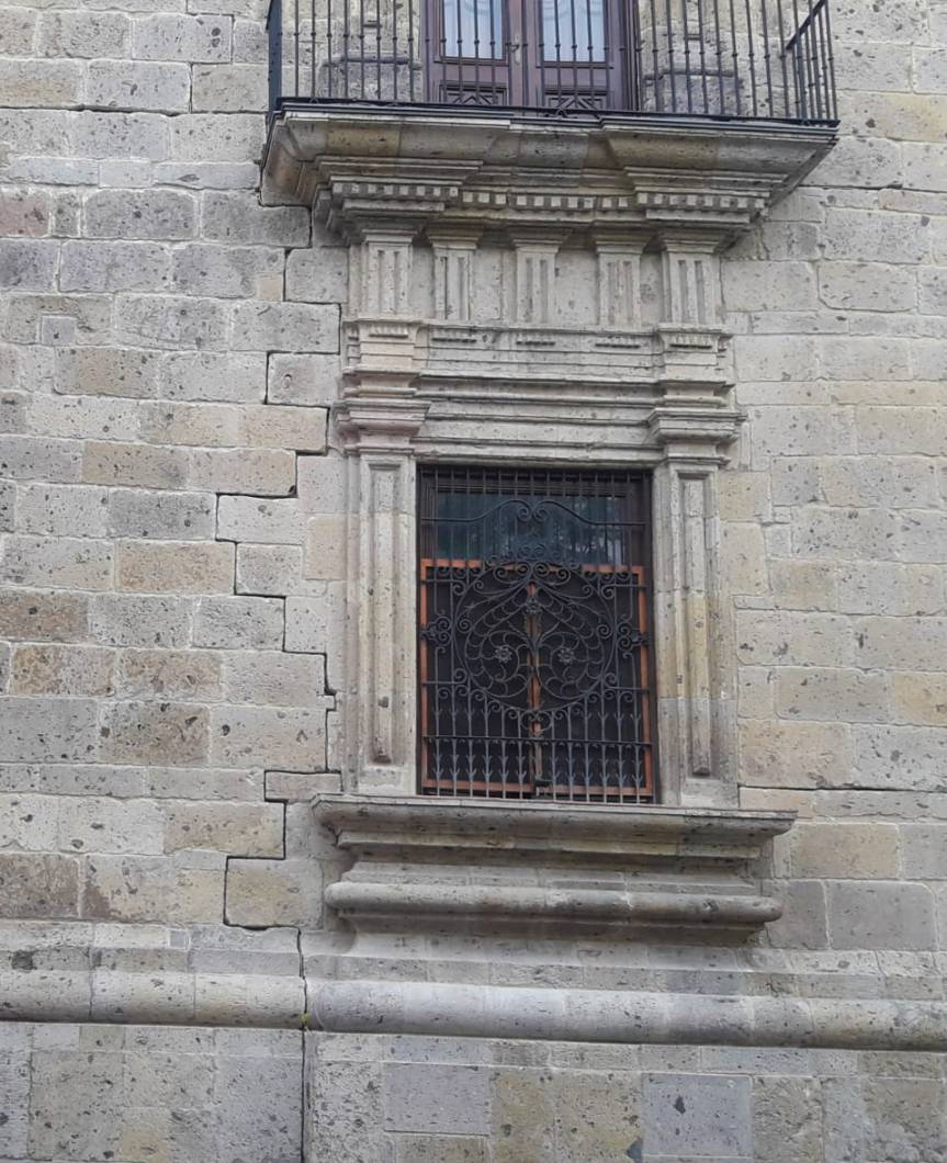 Con una mirada más cercana los detalles se aprecian mejor, las ranuras sirven de canaleta para un cableado que iluminará el Palacio de Gobierno con luces led y de diferentes colores, pero también se aprecia daño en algunas lozas de cantera dorada que deberán de ser reparadas pero al parecer los bancos donde se sacó este material en Atemajac, el Batán ya fueron agotados.