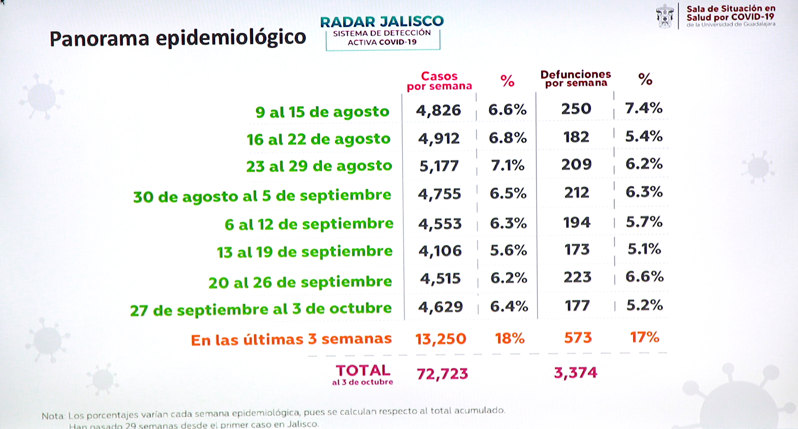 Recordó que del 9 al 15 de agosto se registraron 4 mil 826 casos en Guadalajara, y del 13 al 19 de septiembre se tuvo la menor cantidad, con 4 mil 106 infectados, pero comenzó un repunte, del 27 de septiembre al 3 de octubre, al presentarse 4 mil 629 contagios. Tan sólo en las últimas tres semanas se han registrado 13 mil 250 casos positivos en la entidad.