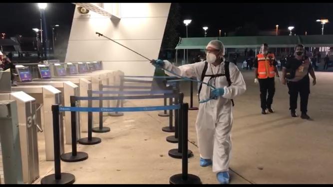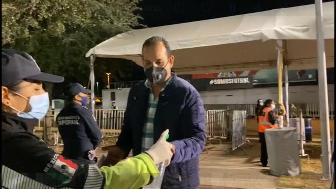 Desde la tarde de éste miércoles, en la explanada del estadio fue sanitizada por personal ataviado con trajes tivex de color blanco, provistos de mascarillas antigases, y rociaron con sales cuaternarias las áreas comunes de acceso, para que los asistentes pudieran permanecer en un sitio específico, previo al aforo.