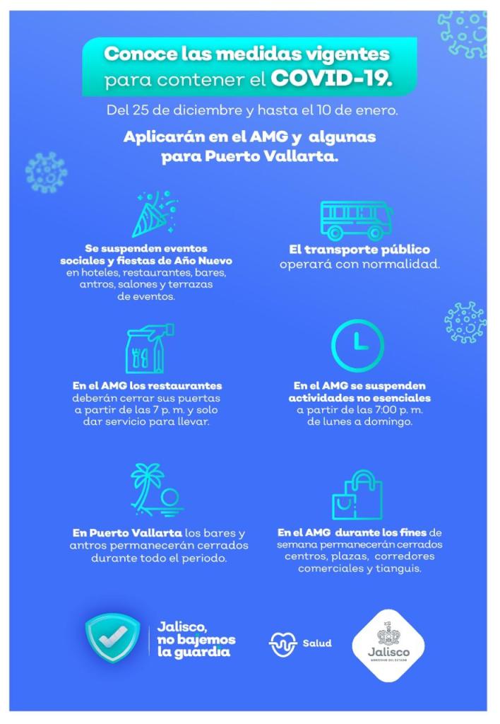 Con el objetivo de romper la cadena de contagios y establecer condiciones favorables para el regreso a clases en enero de 2021, así como mantener el equilibrio entre la protección a la salud y la actividad económica, el Gobernador de Jalisco, Enrique Alfaro Ramírez, anunció este lunes medidas de contención ante COVID-19, que implica el cierre de actividades no esenciales a las 7 pm; así como cierre de plazas y centros comerciales los fines de semana, y la prohibición de fiestas de fin de año, entre otras.