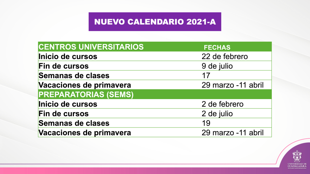 Para las licenciaturas y posgrados que se imparten en los centros universitarios, el inicio de cursos será el 22 de febrero y el fin de cursos se fijó para el 9 de julio, con un total de 17 semanas de clases.
