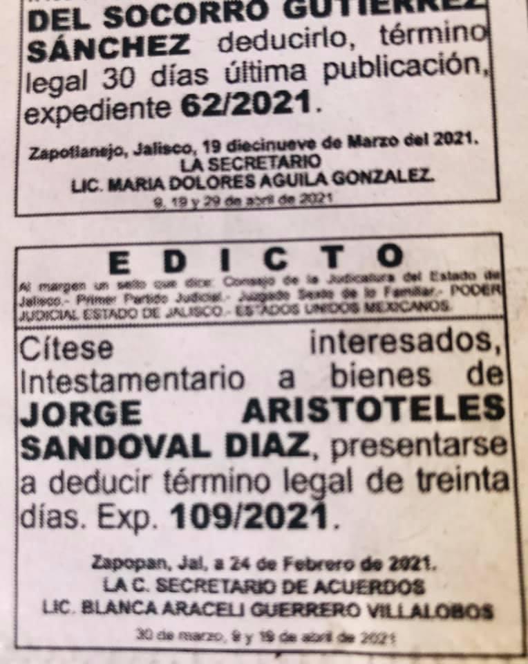 Aristótles Sandoval era padre de dos mujeres, ya adultas, y dos menores de edad. Los edictos son convocatorias para personas vinculadas, o interesadas en procesos jurídicos. El Código Civil establece que los herederos o derechohabientes de recursos, o bienes. El proceso intestamentario inició en enero de 2021, con el número 109.