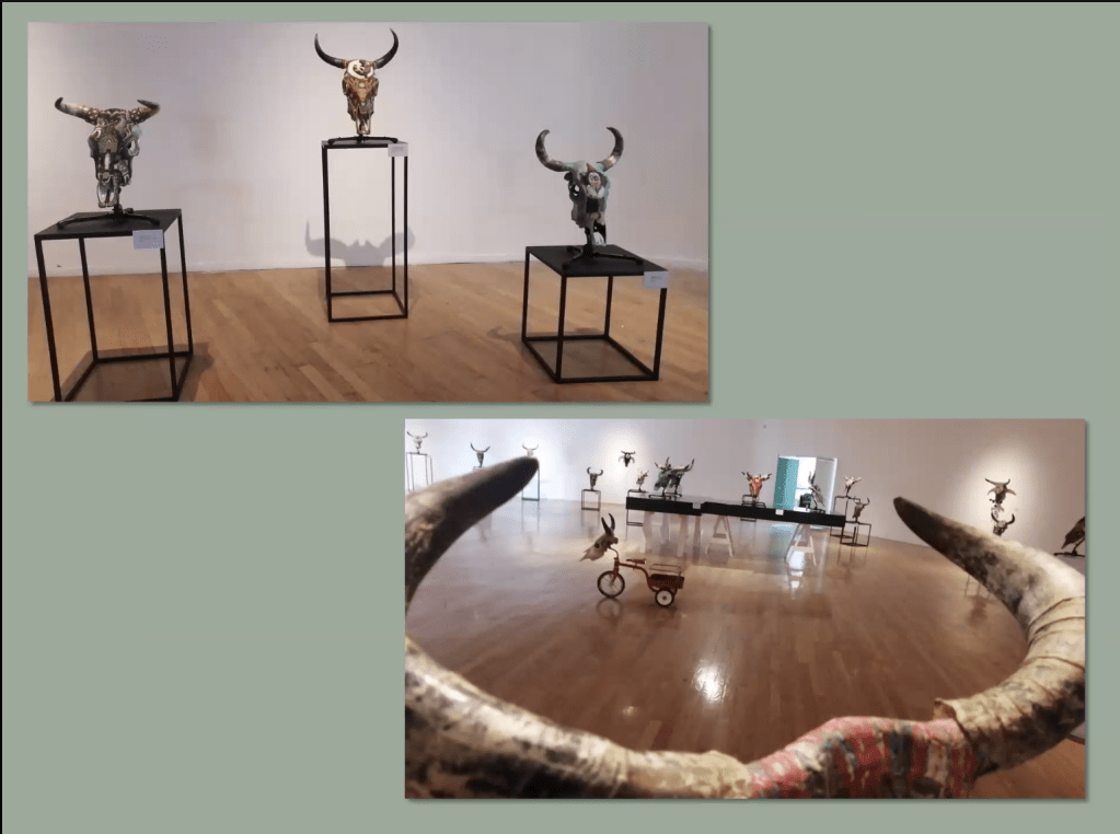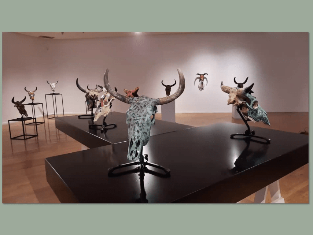 Treinta dos cráneos de vacas, toros y bueyes fueron el lienzo en el que artistas plasmaron realidades que históricamente se han confrontado. Desde el mito y la historia, hasta la ironía y el surrealismo son los temas de estas piezas que se presentan en el Museo Raúl Anguiano (MURA).