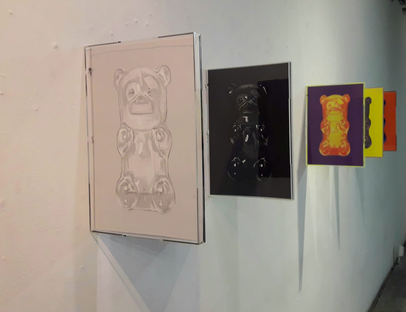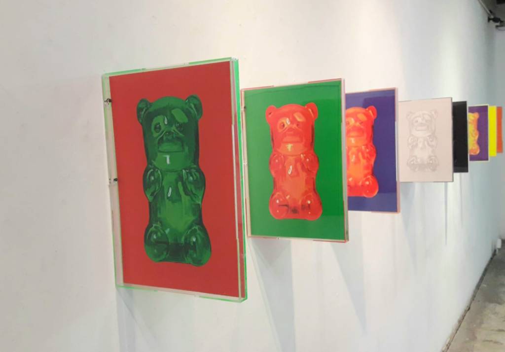 La exposición sorprende con lo que en apariencia, forma y colores son panditas de gomitas, en otra zona son juguetes y animalitos de peluche, todo lleno de intensidad, de ternura y un brillo de alegría.