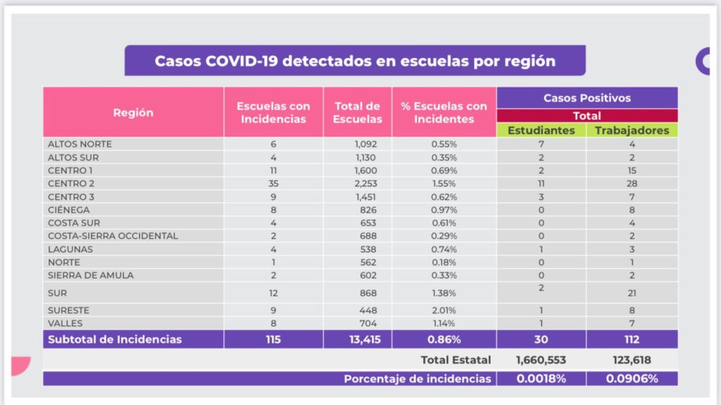 Aclaró que de los 327 casos activos (en la población de 3 a 14 años de edad) de la semana pasada, hoy se tienen 341 que a su entender se mantuvo casi estable. Se detectaron 30 casos en alumnos que fueron derivados para su tratamiento correspondiente, lo que representa solo el .0018 por ciento del universo escolar básico en Jalisco y aclaró que se tiene que entender que estos casos no quiere decir que se contagiaron en la escuela.