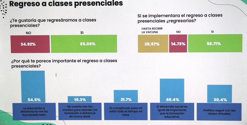 “Nos vimos alarmados de que casi 75 por ciento de la población vive con algún cuadro de estrés, frustración y ansiedad. Casi 67 por ciento se siente desanimado y con falta de propósito en sus clases; casi 50 por ciento ha tenido insomnio y falta de apetito, y 35 por ciento se ha sentido solo”, manifestó.