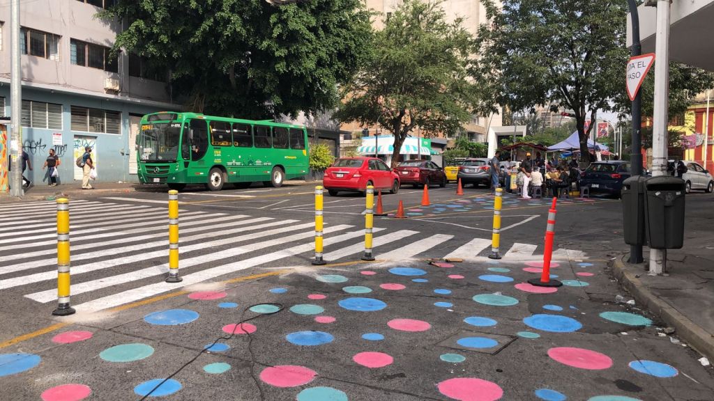 A través de la intervención de Urbanismo Táctico, con la validación técnica del Municipio, se atendieron alrededor de 13 pasos peatonales con pinta lúdica y colocación de bolardos abatibles, en la intersección de avenida Ramón Corona, Colegiales y Libertad, a unas cuadras de la zona conocida como Los Dos Templos
