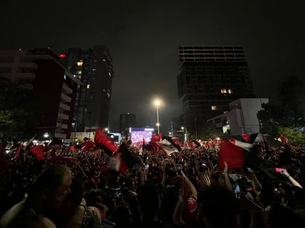 Fue entonces que comenzó a llover, y los aficionados seguían brincando y entonando cánticos futboleros, atentos a la pantalla gigante que se colocó para seguir el partido.