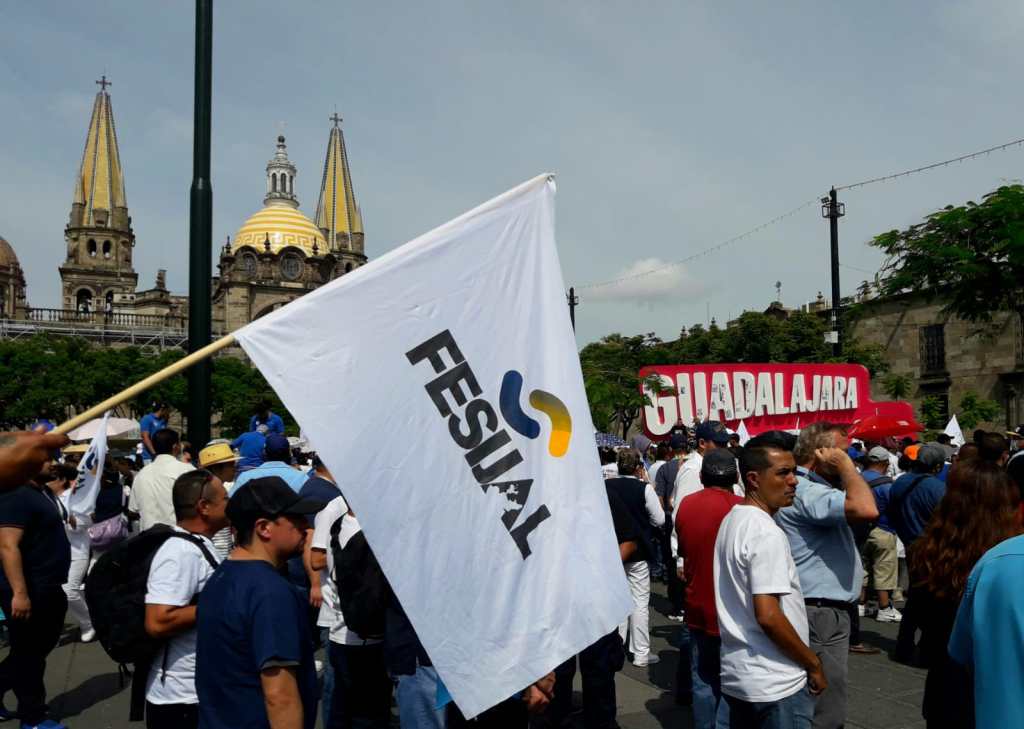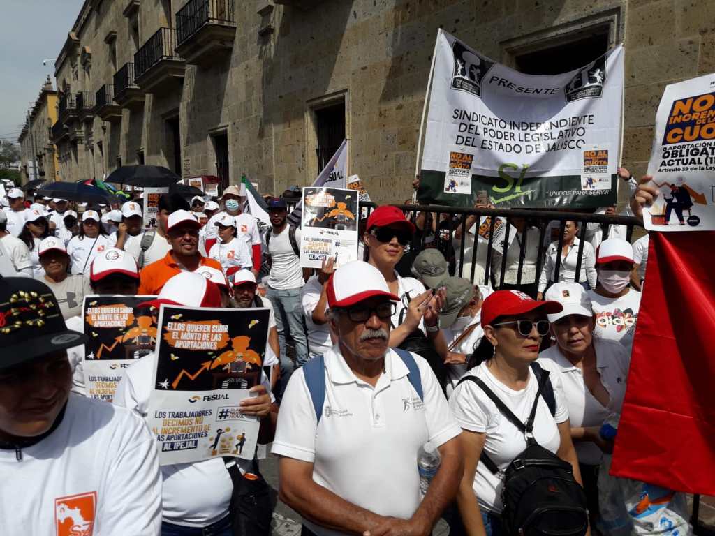 Esta mañana miles de trabajadores al servicio del estado agrupados en la Federación de Sindicatos Independientes de los Municipios y Organismos Públicos de Jalisco (FESIJAL) marcharon por las principales avenidas del primer cuadro de Guadalajara con rumbo al Congreso del Estado para entregar un documento en donde exponen los puntos que a su consideración debe de incluir la reforma a la ley del Instituto de Pensiones del Estado de Jalisco (IPEJAL).