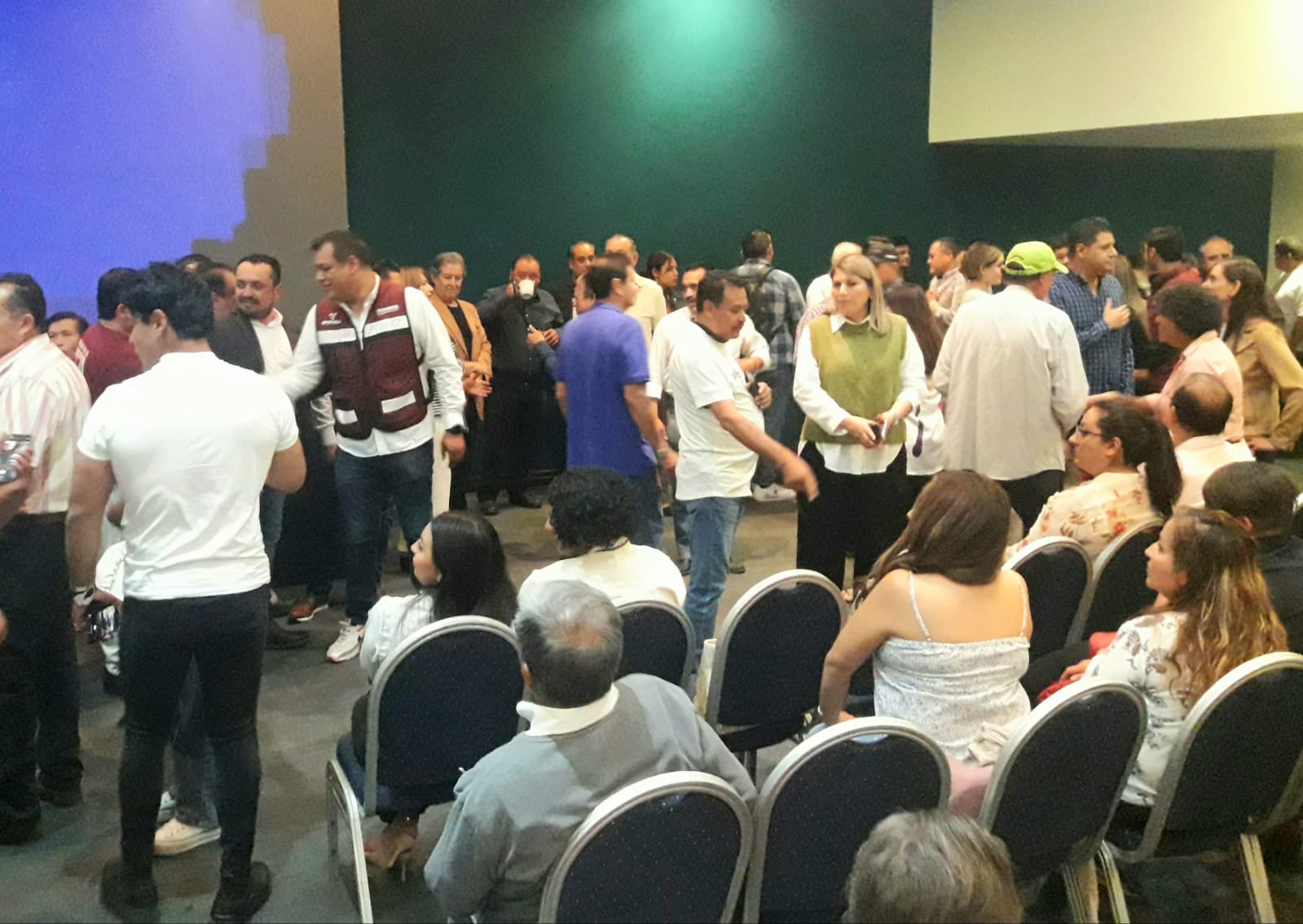 Una hora con quince minutos de retraso la responsable de llevar el evento trató de por fin iniciar, solicitando a los personajes encumbrados de este partido y sus acompañantes de que tomaran asiento, simplemente la ignoraron, y si a esto se le agrega que como parte de esta desorganización omitieron colocar una mesa que funcionara como presídium para que los oradores principales se pudieran sentar mientras iniciaba el evento y tal vez darle un poco de orden a su asamblea informativa, la presentadora pedía que se sentaran, pero no había en dónde.