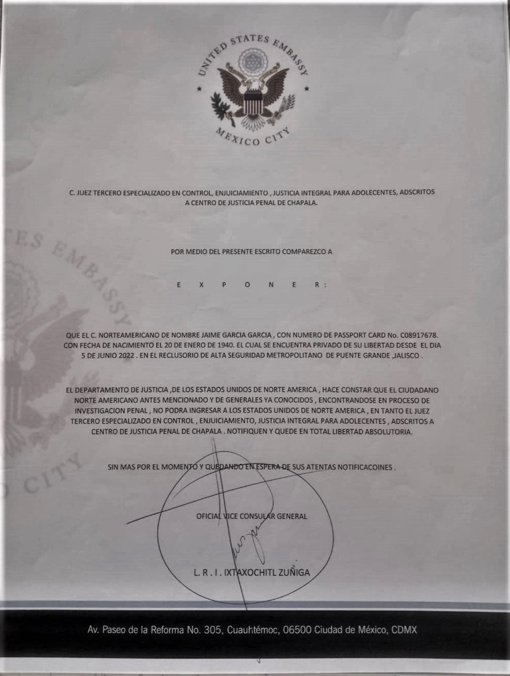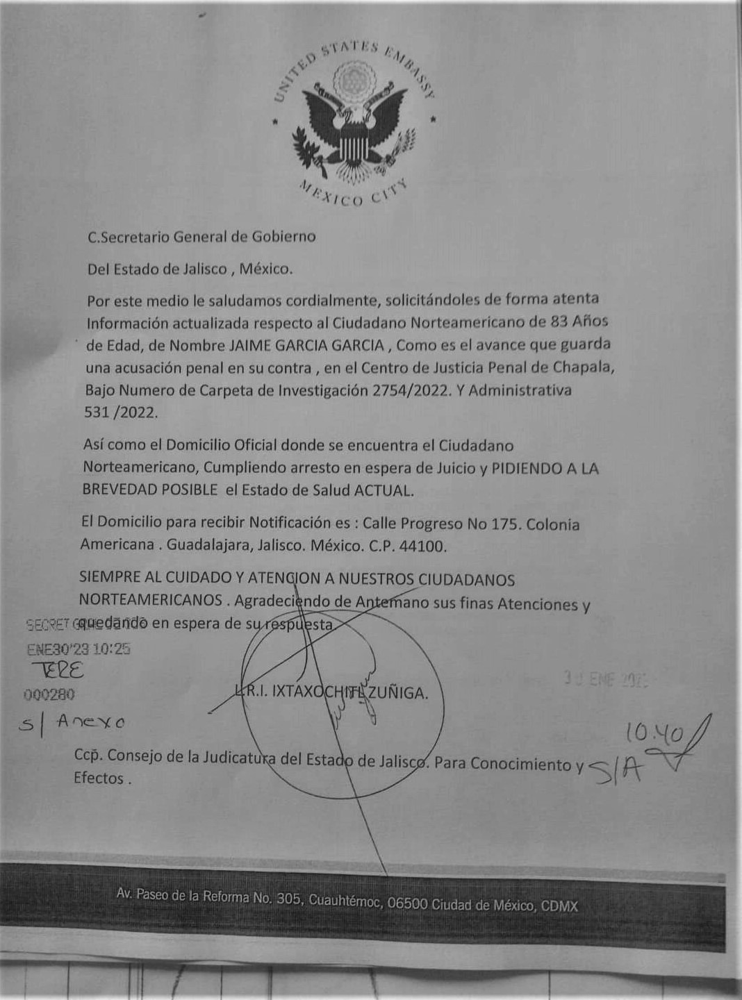 Fue apenas el 8 de abril pasado, cuando elementos de seguridad de la representación diplomática estadounidense tuvieron acceso a Jaime García para corroborar su estado de salud.