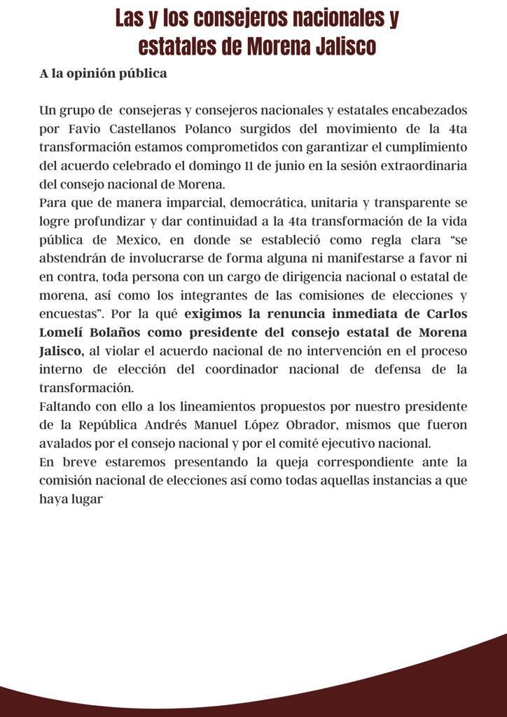 Por lo que exigimos la renuncia inmediata de Carlos Lomelí Bolaños como presidente del Consejo Estatal de Morena Jalisco, al violar el acuerdo nacional de no intervención en el proceso interno de elección del Coordinador Nacional de Defensa de la Transformación.