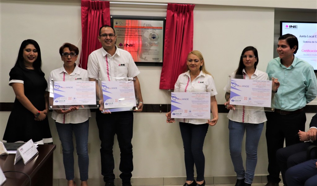 En su intervención Rosa Margarita Lara Vocal del Registro Federal de Electores, expresó su reconocimiento y agradecimiento a la empresa por el esfuerzo del logro y la implementación del trabajo para alcanzar la certificación. “Valió la pena y hoy lo vemos materializado, a partir de hoy hemos llevado el seguimiento a través de la aplicación de las encuestas con la ciudadanía, el trabajo en los módulos es sumamente valioso y ello se ve reflejado en las opiniones por arriba del 95% es buena y excelente, así como el clima laboral con nuestros compañeros”. Exhortó para continuar trabajando con profesional desempeño y apego a la normativa y procesos operativos, pues dijo que estamos inmensos en una mejora laboral continua.