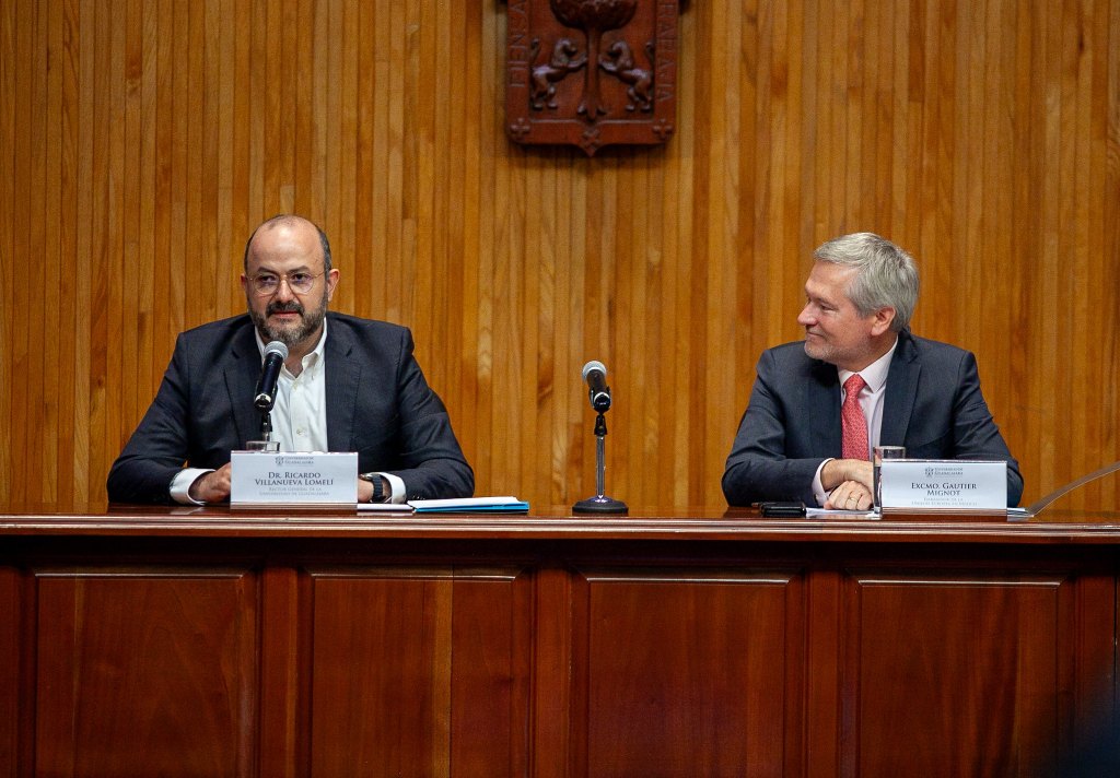 En una conferencia de prensa realizada esta mañana en el Paraninfo Enrique Díaz de León de la Universidad de Guadalajara (UdeG), se anunció el programa general de actividades 2023. La actividad contó con la presencia de Ricardo Villanueva Lomelí, rector general de la Universidad de Guadalajara (UdeG); Gautier Mignot, embajador de la Unión Europea en México; Marisol Schulz Manaut, directora general de la FIL Guadalajara; Karla Planter Pérez, rectora del Centro Universitario de los Altos de la UdeG y coordinadora ejecutiva del programa académico de la FIL Guadalajara, y por vía remota, Patricio Jeretič, curador del programa de la Unión Europea.
