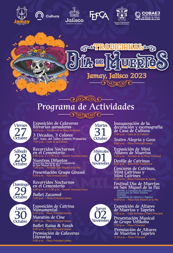 El martes, se inaugura la decoración y escenografía de Casa de la Cultura, a las 20:00 teatro en la plaza principal con Alegría y Gozo; iniciando noviembre los visitantes podrán apreciar la exposición de mini altares de muertos que se colocarán en los portales de la plaza principal; en punto de las 18:00 se tiene programada un desfile de catrinas; un concurso de catrinas, mini catrinas y mini catrines esto a las 19:30.