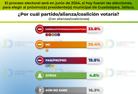 Con respecto a la intención de voto por partido, Morena también lideró la encuesta con “Chema” Martínez como candidato, con el 44 por ciento, por sobre la senadora con licencia Verónica Delgadillo (MC) con 32 por ciento, o la diputada local del PAN en Jalisco, Mirelle Montes, con 17 por ciento.