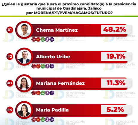 Sobre por cuál de los aspirantes de Morena votarían si hoy fueran las elecciones, José María “Chema” Martínez obtiene el 48.2 por ciento; seguido muy atrás del ex alcalde de Tlajomulco de Zúñiga, Alberto Uribe con un 19.1 por ciento.