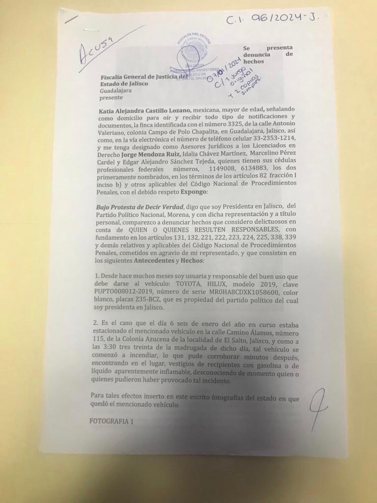 La dirigente del partido Movimiento Regeneración Nacional, (MORENA) en Jalisco, Katia Castillo Lozano califica como un acto de intimidación y acoso al incendio del vehículo utilitario que le fue asignado por su instituto político.