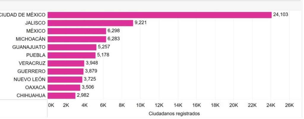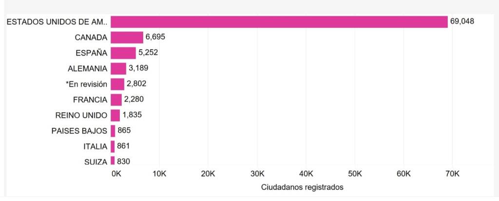 Asimismo, el 75.75 % de los registros se han hecho con una Credencial para Votar expedida en el extranjero y el país que concentra la mayor cantidad de registros es Estados Unidos con 68 mil 898. En el caso de la entidad de origen, la Ciudad de México, Jalisco y Michoacán son los estados con mayor número de solicitudes con 24 mil 036, 9 mil 194 y 6 mil 271, respectivamente.