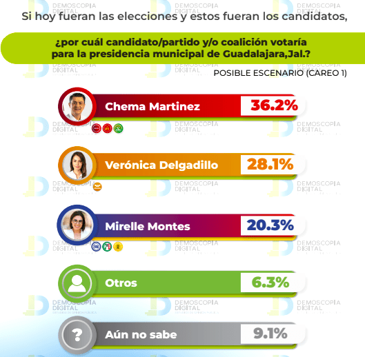 En el escenario de que los candidatos fueran Chema Martínez (Morena), Verónica Delgadillo (MC), Mirelle Montes (PAN); el representante de la 4T obtiene un 36.2 por ciento; la emeceísta en un segundo lugar con el 28.1 por ciento; y la panista 20.3 por ciento superando el doble con solo el nombre del partido. Por otros candidatos sin especificar el 6.3 por ciento y quienes aún no deciden su intención del voto alcanza el 9.1 por ciento.