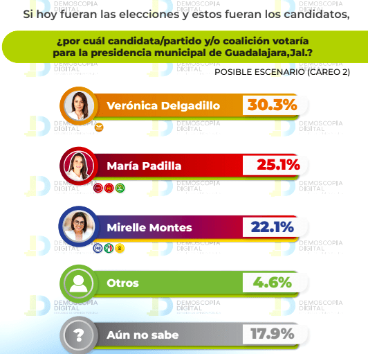Demoscopía Digital pone en el escenario a la diputada María Padilla en lugar de José María Martínez. Bajo este supuesto Verónica Delgadillo (MC) obtiene el 30.3 por ciento de la intención de voto para elegir a quien encabezará la próxima administración pública tapatía; María Padilla (Morena) cae al segundo escaño con el 25.1 por ciento; Mirelle Montes (PAN) sube su porcentaje con 22.1 por ciento. Por otros personajes sin especificar se manifestó el 4.6 por ciento y quien no sabe por quién votaría llega al 17.9 por ciento.