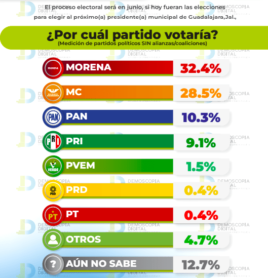 Al reactivo y en el supuesto de que hoy fueran las elecciones para elegir al próximo presidente municipal de Guadalajara, un 32.4 por ciento señaló que se irían por Morena; Movimiento Ciudadano cuenta con el 28.5 por ciento de las preferencias; y en un lejano tercer lugar Acción Nacional con solo el 10.3 por ciento; PRI llega al 9.1 por ciento, y en la lona el PVEM con solo el 1.5 por ciento, PRD y PT comparten el 0.4 por ciento de preferencias electorales; por otros partidos sin hacer mención de ellos llega el 4.7 por ciento y con el 12.7 por ciento personas que aún no deciden por cuál votarían.