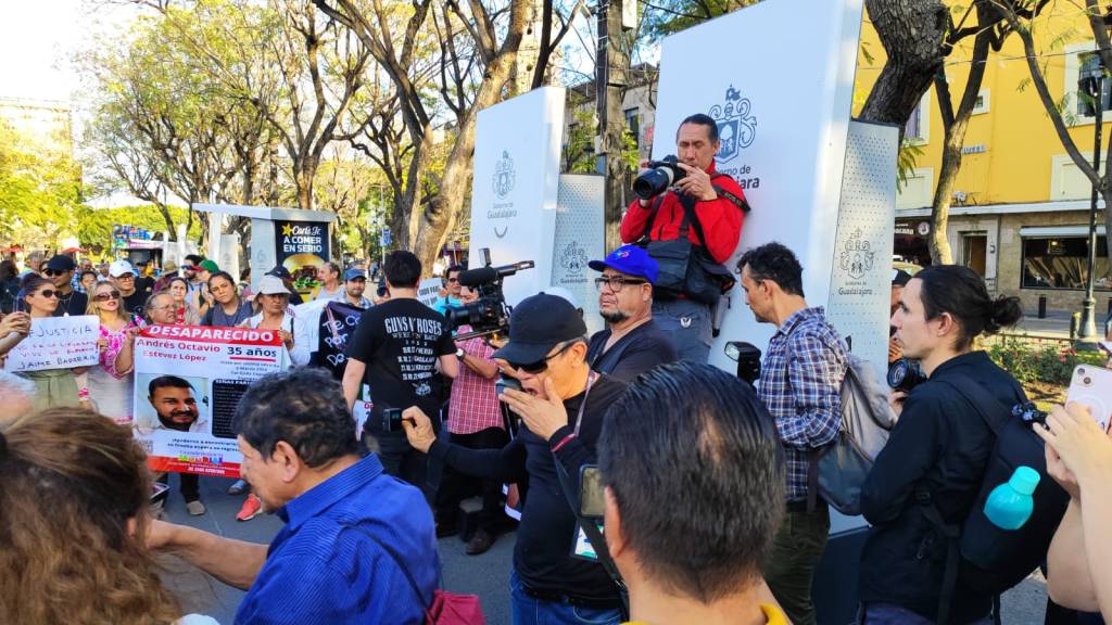 Un nutrido grupo de reporteros fotógrafos, miembros de grupos con familiares desparecidos, familiares y amigos se manifestaron esta tarde en la Plaza de la Liberación para protestar por la desaparición del periodista Jaime Barrera quien fue plagiado la tarde de este lunes por tres sujetos armados.
