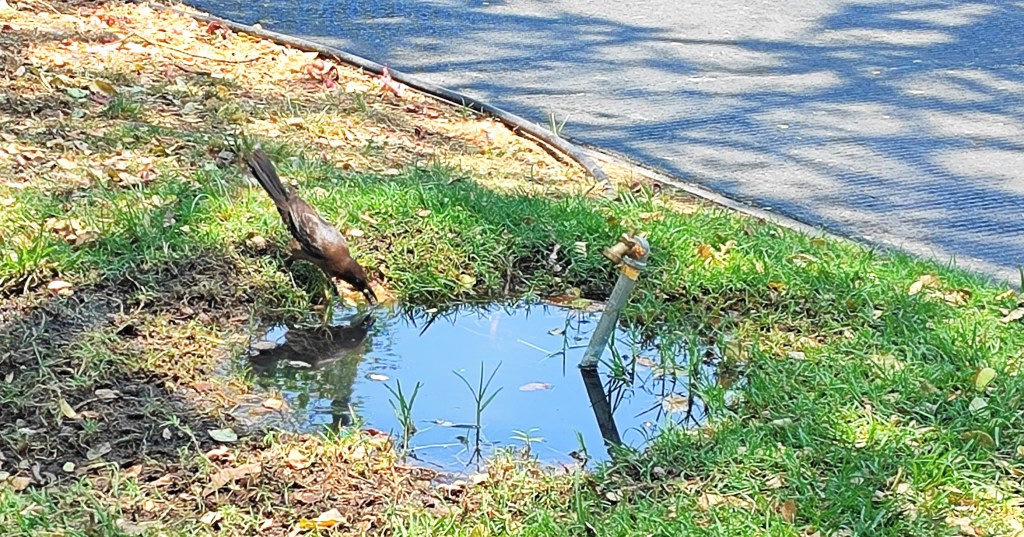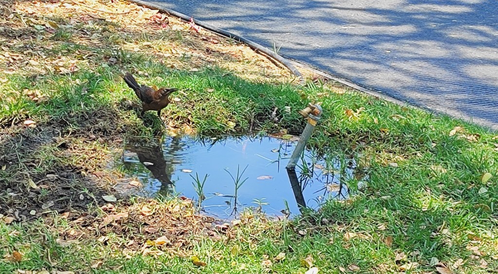 Pájaro por fin ve un espejo de agua y decide bajar para tomar un poco o tal vez un buen trago.
