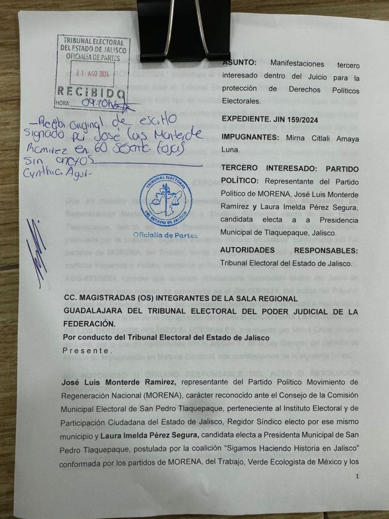 “En tiempo y forma, presentó la presidenta municipal electa de San Pedro Tlaquepaque Laura Imelda Pérez Segura, sus respectivas manifestaciones como tercero interesado dentro del Juicio para la Protección de Derechos Político Electorales (SG-JDC-589/2024) y el Juicio de Revisión Constitucional Electoral (SG-JRC-247/2024), ambos se desprenden del Juicio de Inconformidad JIN 159/2024, y son promovidos por Movimiento Ciudadano ante la Sala Regional Guadalajara, del Tribunal Electoral del Poder Judicial de la Federación”.