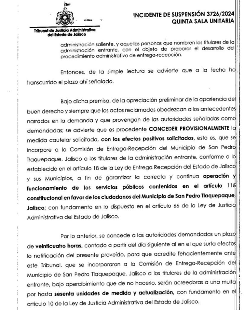Pérez Segura solicitó las medidas al TJA, a través del Incidente de Suspensión 3726/2024, y que fueron otorgadas por la Quinta Sala Unitaria «a fin de garantizar la correcta continua operación y funcionamiento de los servicios públicos contenidos en el artículo 115 constitucional en favor de los ciudadanos del Municipio de San Pedro Tlaquepaque, Jalisco; con fundamento en lo dispuesto en el artículo 66 de la Ley de Justicia Administrativa del Estado de Jalisco»