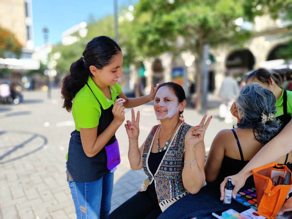 Llamó la atención una isla de maquillaje, con unas chicas con camiseta verde quienes no se cansaban de recibir clientas para su transformación, eran representantes de la asociación C-Integra quienes a cargo de la maestra Fabiola demostraron la creatividad de sus talleristas y auxiliares.