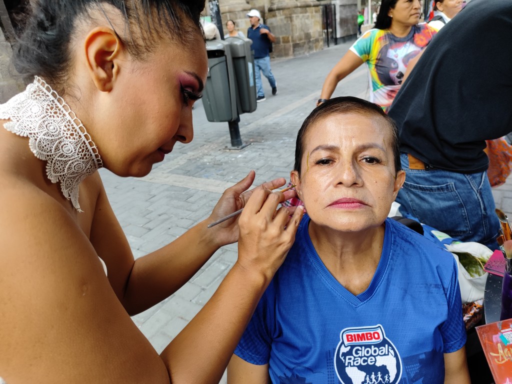 Prepararse para el recorrido tiene su chiste, no es llegar y a los cinco minutos estar lista para el vestuario, de ahí el reconocimiento al colectivo de artistas del maquillaje y bodypaint que colaboran de manera altruista con esta causa, quienes desde las 14:00 horas llegaron puntuales a Plaza Universidad para empezar el proceso de transformación.
