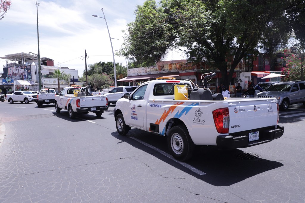 Tras la toma de protesta, Delgadillo García dio el banderazo a las camionetas fumigadoras y a los equipos de la Secretaría de Salud Jalisco que estarán recorriendo las colonias del Área Metropolitana de Guadalajara para combatir al mosquito trasmisor del dengue.