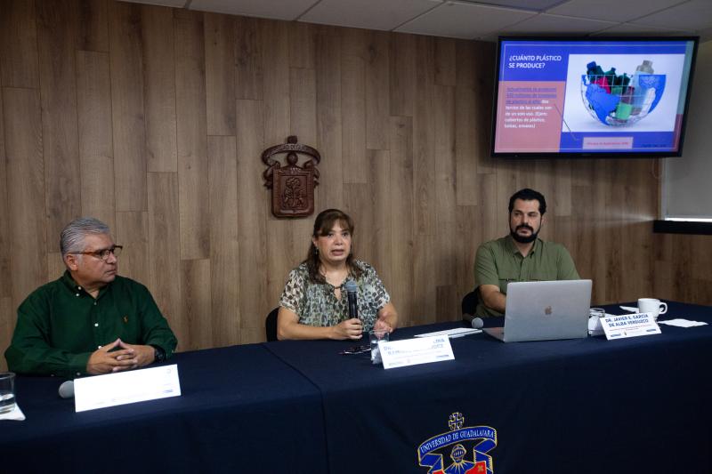 La Jefa del Departamento de Ecología Aplicada del CUCBA, doctora Blanca Catalina RamírezHernández, en rueda de prensa explicó que la producción de plásticos ha incrementado en los últimos 100 años con el aumento del consumo de empaques de un solo uso.
