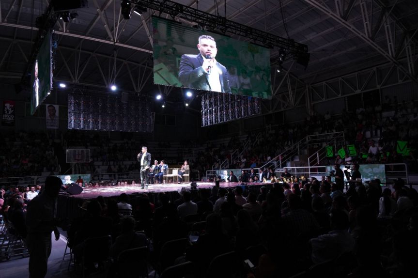 Bajo el lema de “Somos Hechos, No Palabras”, el alcalde morenista rindió su primer informe de gobierno destacando que la seguridad como uno de los rubros más importantes se ha logrado bajar la tasa de homicidios dolosos a CERO, igual estadística que se tiene en robo de vehículos.