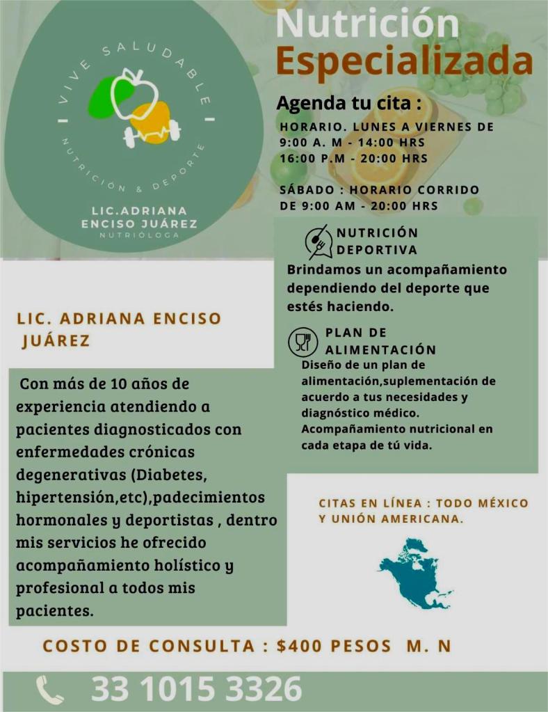 Para conocer cómo estás en materia de nutrición saca una cita en Vive Saludable, Nutrición & Deporte al 3310153326, con Adriana Encino, tu futuro y tu salud lo merecen.