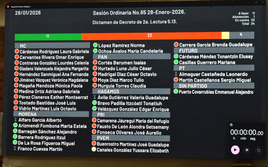 De esta manera y luego de casi dos horas de discusión y posicionamientos partidistas, en donde los argumentos de un lado y del otro solo sirvieron para alargar la sesión y tal vez para que los diputados tengan material para sus redes sociales, pues ninguno provocó que cambiaran de parecer los contrarios, la votación final fue de 22 votos contra (MC, PAN, PRI, dos del PVEM y uno del PT), once a favor (6 de Morena, dos de Hagamos, las dos diputadas por Futuro y el diputado sin partido Alejandro Puerto) y la abstención de la diputada del Partido Verde Ecologista Yussara Canales.