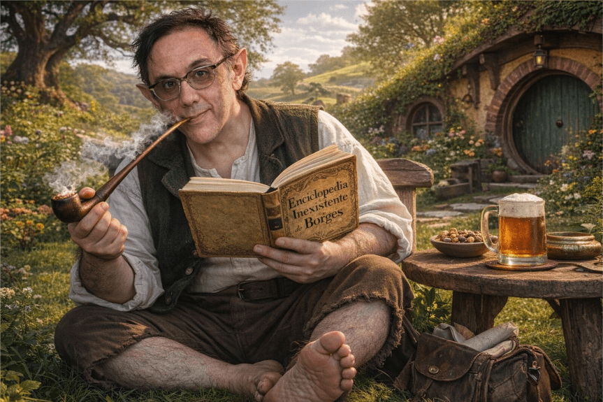 “¡Ay señor!, perdón, espéreme, lo ayudo, todavía podría ver, me presento, soy su fan, gran fan, le preguntaría, ¿por qué se empeñó en difundir la Enciclopedia inexistente? Acuérdate que hay un cuento de Borges, que es como el antecedente, o la profecía de las noticias falsas y de la desinformación de nuestra época. La enciclopedia de un mundo imaginario, que todo el mundo se empieza a creer, y que es absurda, pero eso no le importa a la gente, igual se la cree, o sea, como ahora, exactamente como ahorita, yo le habría dicho, oiga, mínimo se hubiera esperado tantito, una advertencia, algo antes de difundirla, mire cómo estamos” (suelta una carcajada).