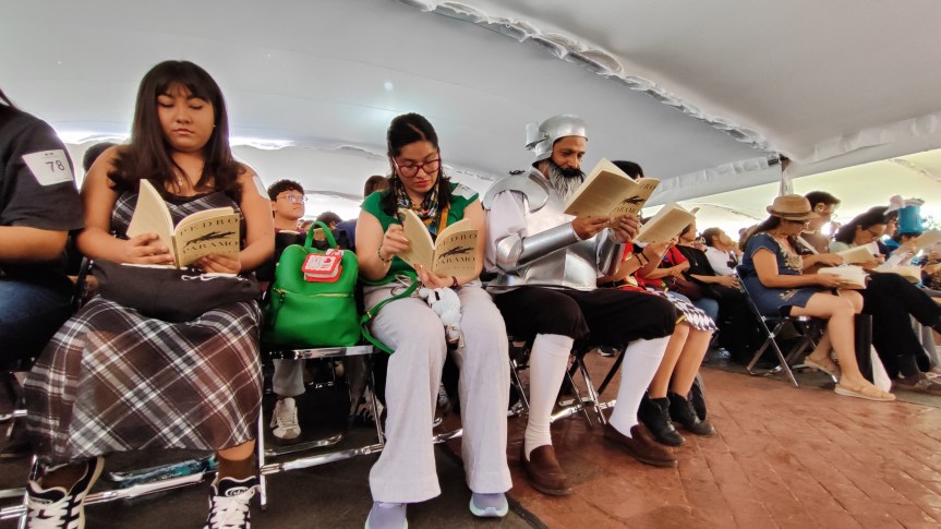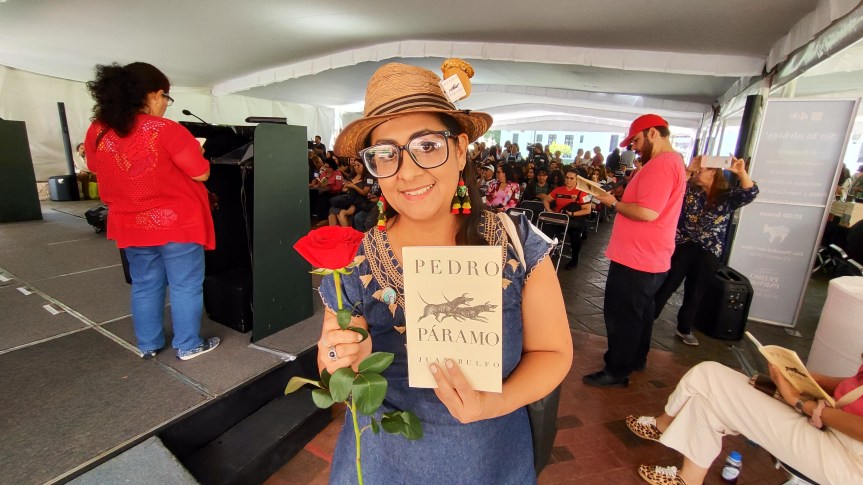 Este jueves por la mañana, en la explanada del edificio de Rectoría General de la Universidad de Guadalajara (UdeG), se reunieron centenares de personas para leer Pedro Páramo, en un pabellón con venta de libros, un espacio de inmersión sonora, un escenario de lectura en voz alta y un ánimo amalgamado por las letras.