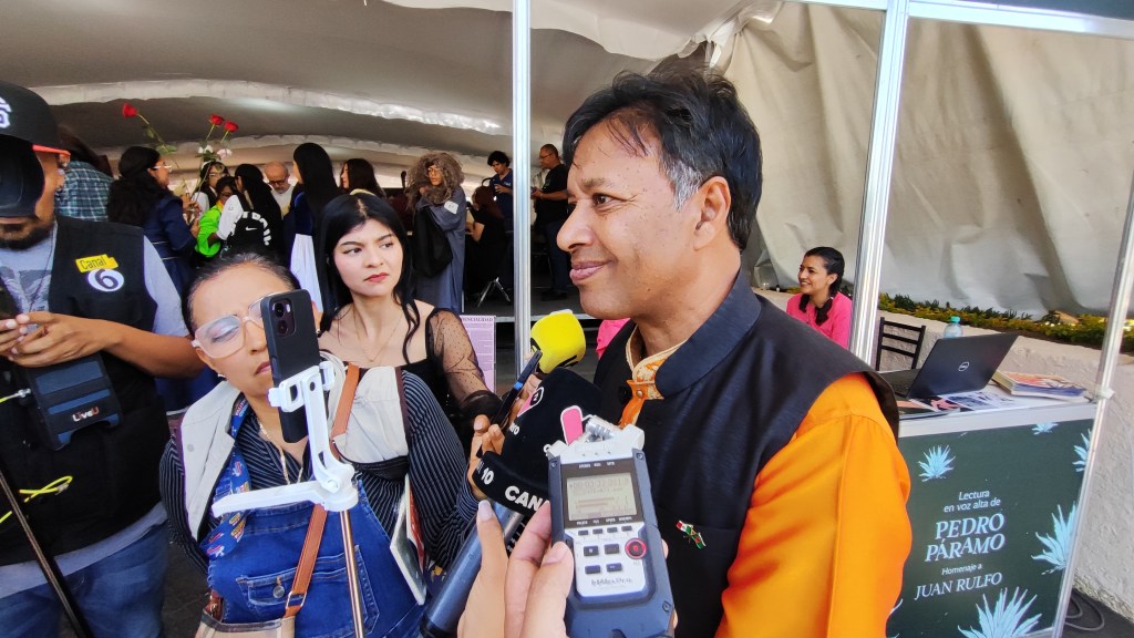 Las primeras palabras que se escucharon de Pedro Páramo en la jornada de maratón de lectura en voz alta fueron en bengalí o lengua bangla, en voz del escritor y traductor Anisuz Zaman, nacido en Bangladesh y radicado en México desde hace cuatro décadas. “Gracias por darme la oportunidad de traducir este gran libro de tan pocas páginas, pero que es tan enorme. El honor es para mí y el idioma bangla, que lo hablan más de 200 millones de personas”, compartió.